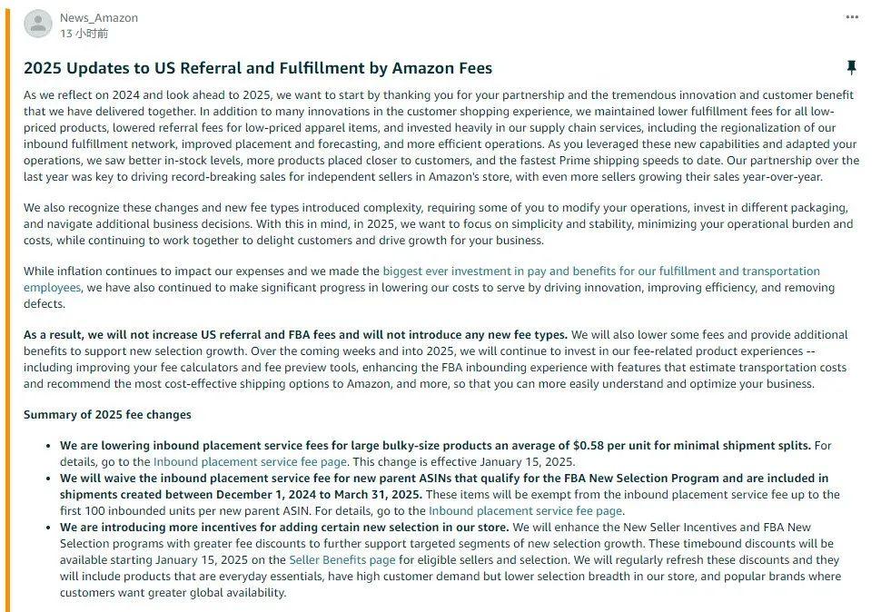 就在此時(shí),亞馬遜美國(guó)站公布了2025年的新政,包含傭金及物流費(fèi)用的調(diào)整。讓人頗感意外的事,歷年來(lái)必漲的